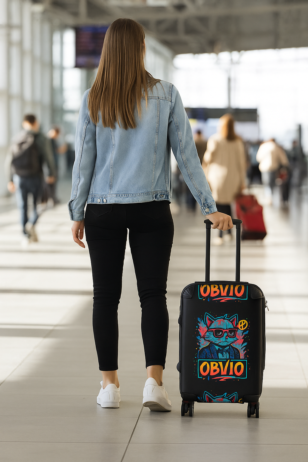 Viajar nunca fue tan estiloso ✈️✨. Esta maleta negra con un diseño urbano y lleno de color destaca por su gato con gafas de sol 🐱🕶️, traje elegante y mucho flow 🔥. Con el logo OBVIO en tonos vibrantes, es imposible que pase desapercibida.