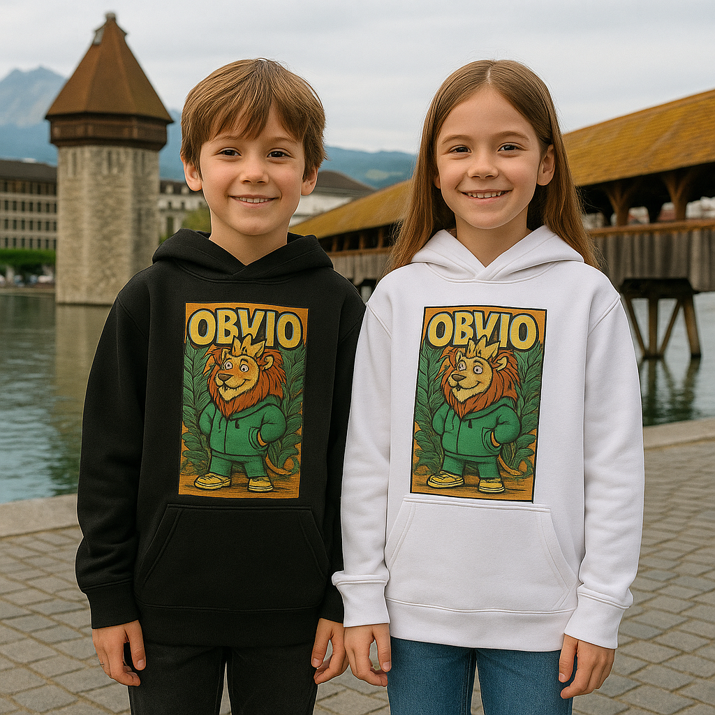 La Sudadera Lion es comodidad y estilo en una sola prenda ✨Destaca por su diseño central con un león simpático y carismático, vestido con sudadera verde, zapatillas amarillas y una corona dorada 👟👑. Encima del león resalta la palabra “OBVIO”, dándole un aire urbano y divertido.