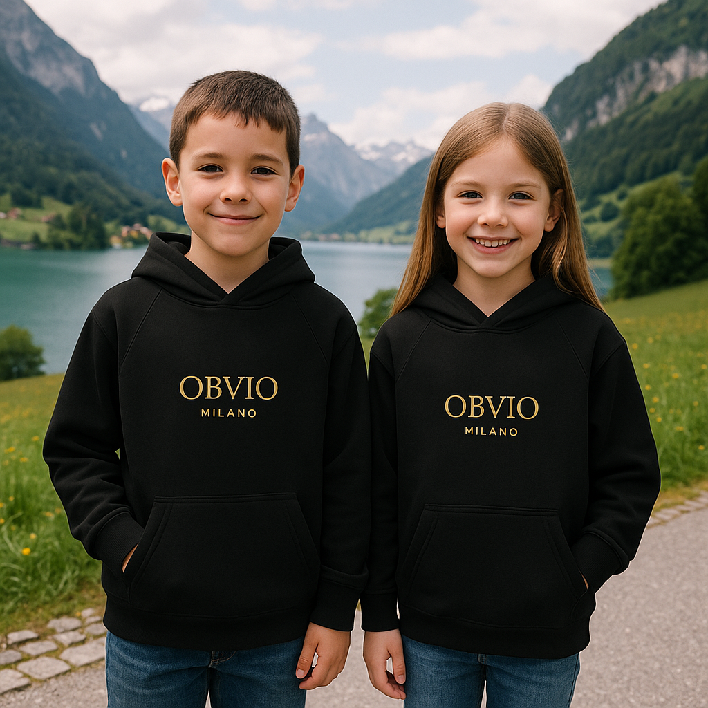 La sudadera Royals está pensada para los más pequeños que también quieren brillar con estilo. Con un diseño elegante 🖤 y el logo dorado OBVIO MILANO ✨, transmite una mezcla de comodidad premium y sofisticación urbana. Su bolsillo canguro 👐 y capucha suave garantizan calidez y practicidad, perfecta para aventuras al aire libre 🌲🏔️ o momentos casuales en la ciudad 🏙️.